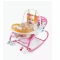 يأتي الكرسي بمقعد مبطن مريح وتصميم جذاب بألوان زاهية، مع قوس علوي يحتوي على ألعاب معلّقة لتنمية مهارات الطفل الحسية والحركية. كما يحتوي على صينية أمامية مزودة بألعاب تفاعلية تساعد على التسلية أثناء الجلوس أو تناول الطعام.